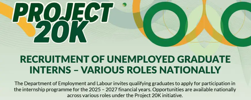 Apply for Project 20K graduate internships — a 24-month paid programme by the Department of Employment and Labour giving unemployed graduates across South Africa work experience to start their careers.